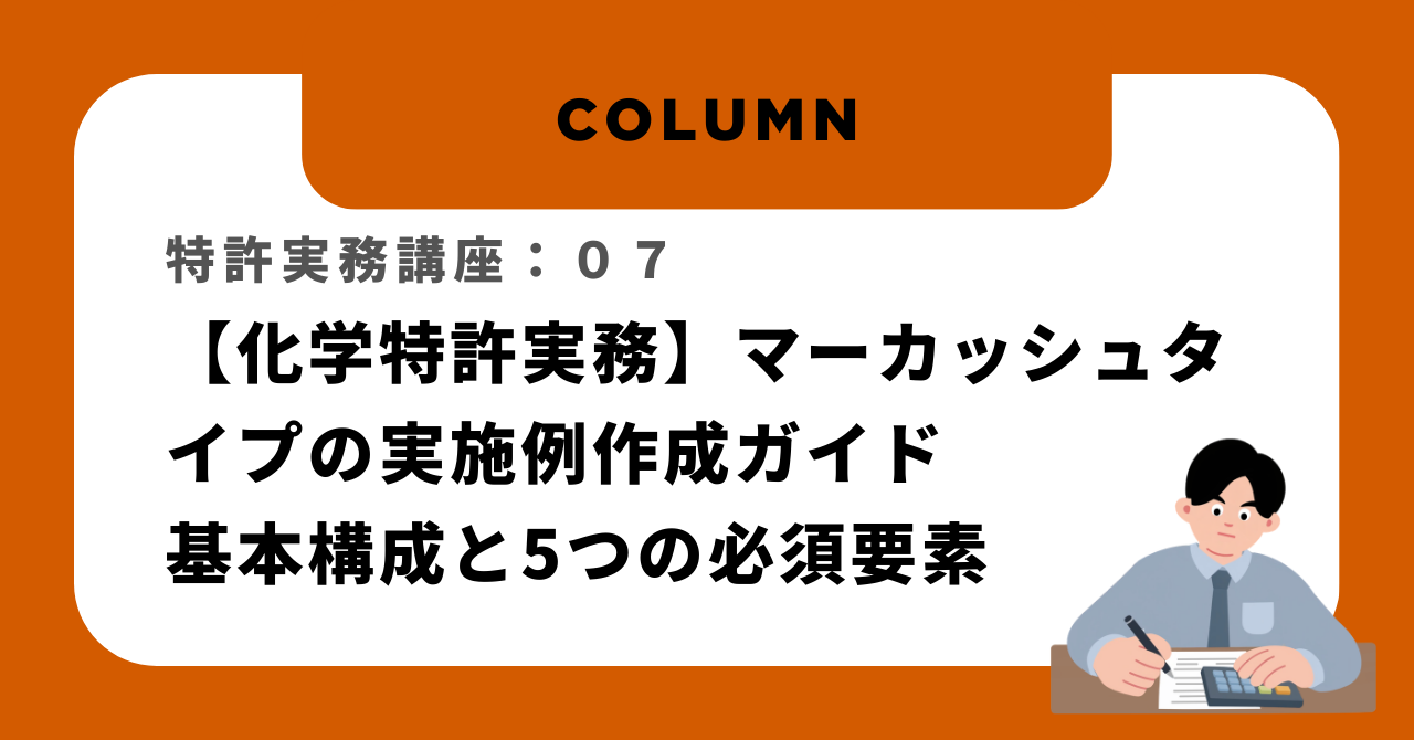 マーカッシュタイプの実施例では、「群の構成要素の具体化」と「網羅的な実施例の提示」が重要です。化学分野では、目に見えない構造を文章で明確に伝える必要があるため、論理的かつ丁寧な記載が求められます。